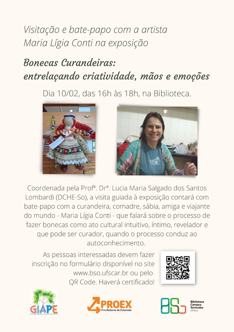 Na atividade, a artista Maria Lígia Conti, idealizadora da exposição, falará com o público sobre o processo de confecção de bonecas como ato cultural intuitivo, íntimo, revelador e curador, no processo que conduz ao autoconhecimento pela descoberta de sentimentos. A iniciativa visa à ampliação da experiência estética das pessoas diante da necessidade de nutrição cultural, de trocas de experiências e afetividades.
