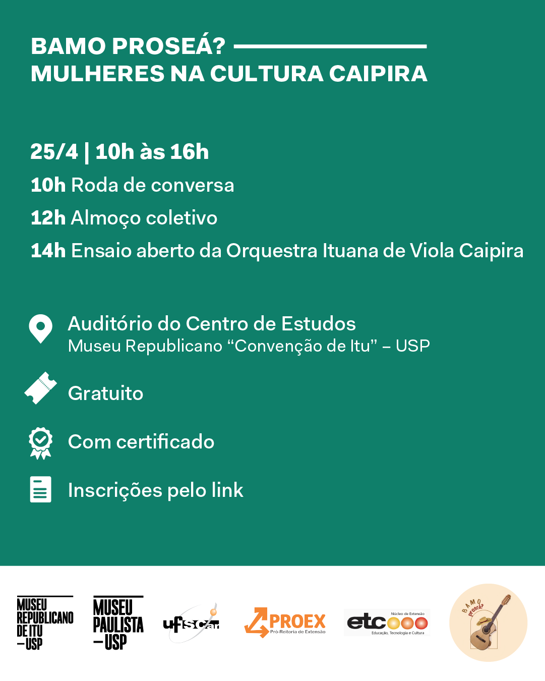 No dia 25 de abril, o Museu Republicano de Itu recebe a atividade "Bamo proseá? Mulheres na cultura caipira", ação que integra o projeto de extensão "Bamo proseá? Cotidiano e cultura caipira", desenvolvido no Campus Sorocaba, com cordenação da professora Neusa de Fátima Mariano, do Departamento de Geografia, Turismo e Humanidades (DGTH-So), e vinculado ao Núcleo de Extensão - Educação, Tecnologia e Cultura (ETC).