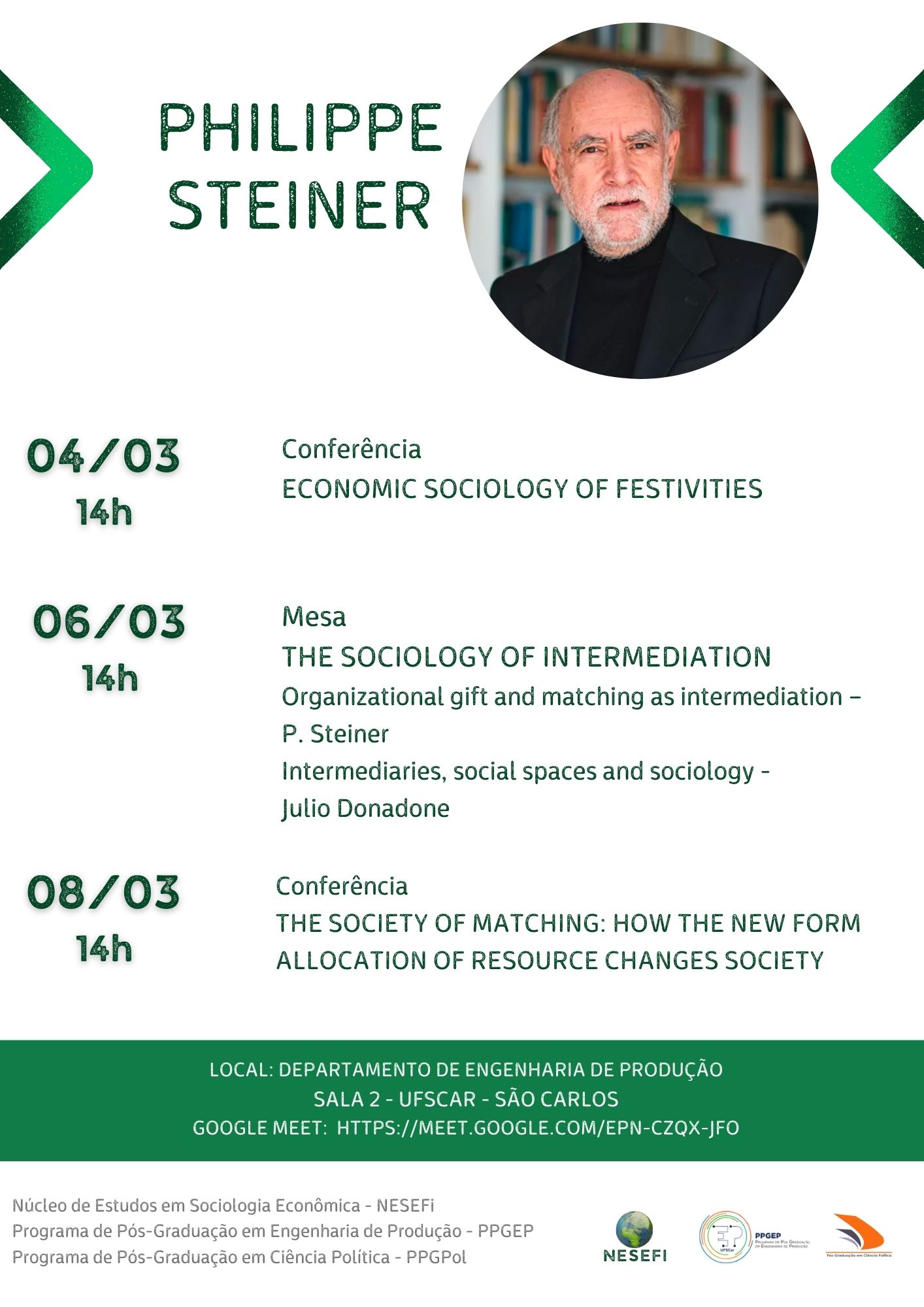 O Núcleo de Estudos em Sociologia Econômica e das Finanças (Nesefi), em parceria com os programas de pós-graduação em Engenharia de Produção (PPGEP) e em Ciência Política (PPGPol), realiza nos dias 4, 6 e 8 de março, uma série de conferências com Philippe Steiner, sociólogo e pesquisador francês da Paris-Sorbonne, quando ele abordará seus trabalhos mais recentes.