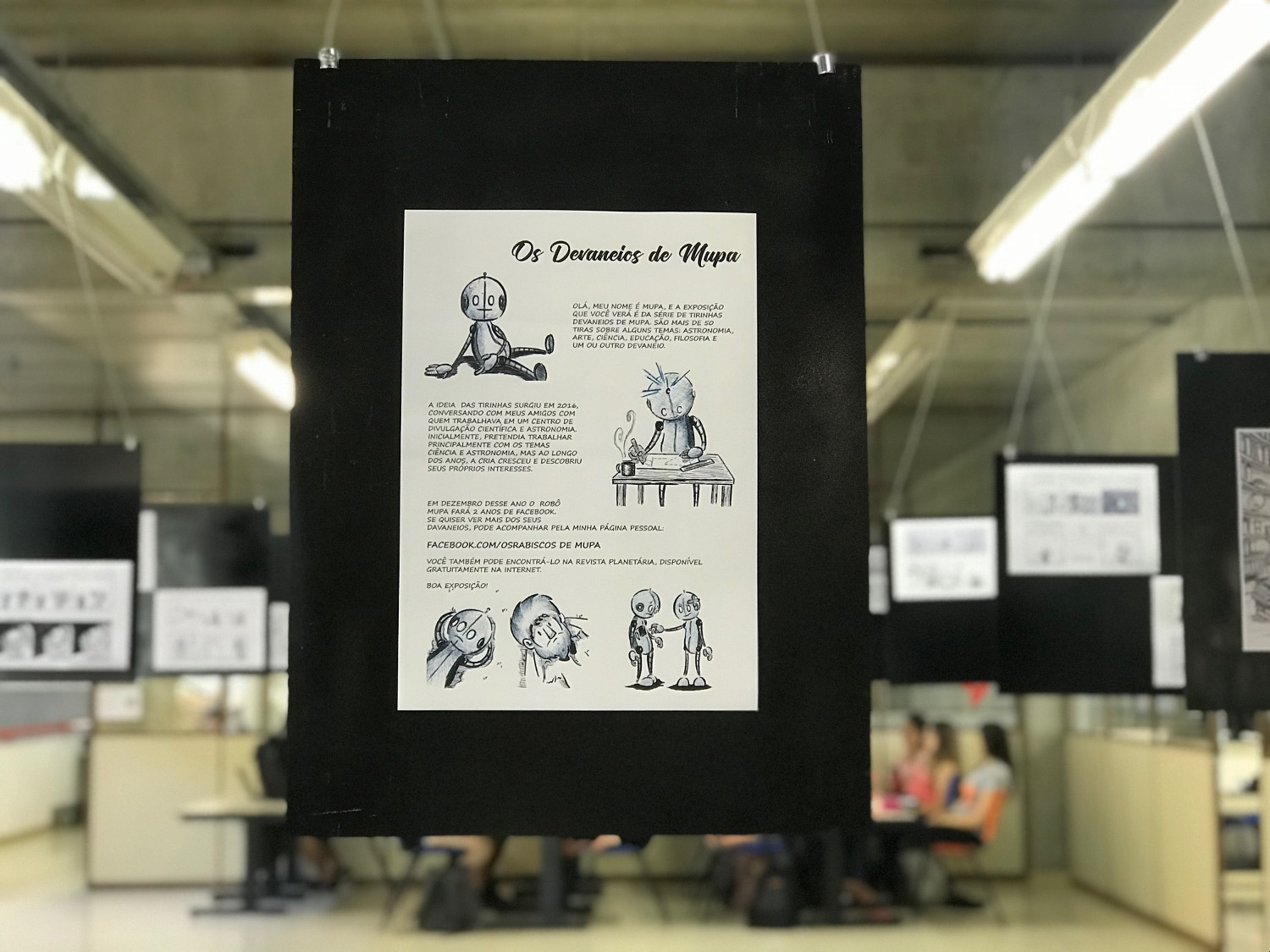 Já a exposição "Os devaneios de Mupa" reúne uma série de tirinhas, cartazes e ilustrações sobre temáticas como Astronomia, Ciência, Filosofia, Artes, Educação e Política. O material foi produzido pelo professor de desenho Murilo Perin, com caneta esferográfica, lápis de cor, giz pastel seco e giz pastel oleoso. "A ideia é estimular reflexões junto ao público sobre temas variados", explica o autor. A série de tirinhas disponível na BCo é também publicada pela revista digital Planetaria, da Associação Brasileira de Planetários (ABP). A mostra está disponível para visitação no Piso 2 da BCo.