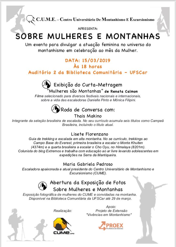 Em celebração ao mês da mulher, o Centro Universitário de Montanhismo e Excursionismo (Cume) promove, no dia 15 de março, o evento "Sobre mulheres e montanhas", que tem como objetivo divulgar a atuação feminina no universo do montanhismo. A programação terá a exibição do curta-metragem "Mulheres são montanhas", de autoria de Renata Calmon e que retrata a vida das escaladoras Danielle Pinto e Mônica Filipini, seguida de uma roda de conversa com Thais Makino, integrante da seleção brasileira de escalada e atual campeã brasileira no esporte; Lisete Florenzano, guia de trekking e escalada em alta montanha e colunista do blog Extremos; e Maria Gabriela Pedroso, escaladora e atual presidente do Cume.