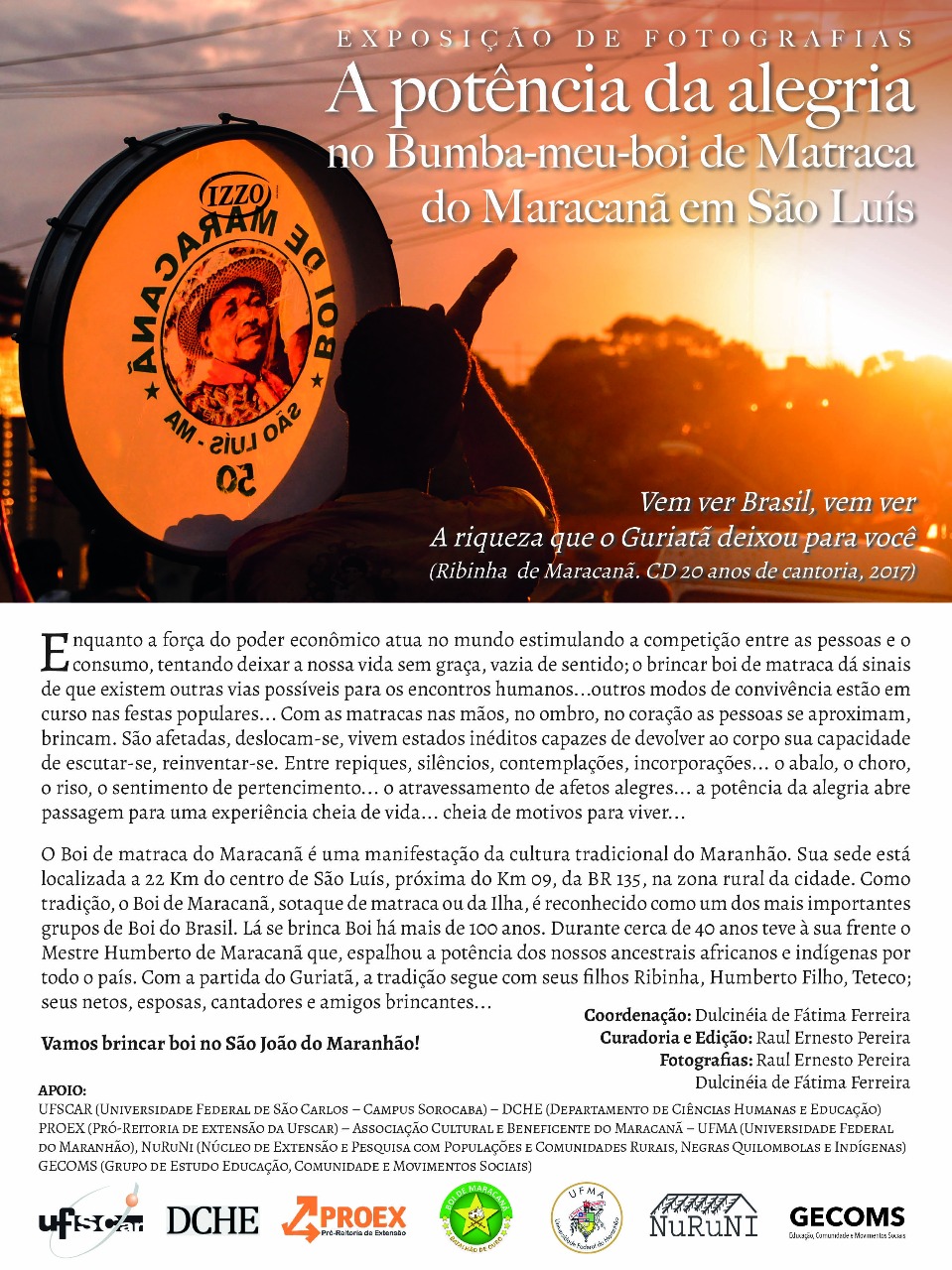De acordo com Ferreira, a exposição está relacionada a sua pesquisa de pós-doutorado intitulada "Cultura popular e processos de subjetivação: desenhando mapas para festa em busca da potência da alegria no Bumba-meu-boi de Matraca do Maranhão", vinculada à UFSCar e à Universidade Federal do Maranhão (UFMA). "Foram cartografados processos inventivos e linhas de vida presentes na manifestação cultural popular Bumba-meu-boi do Maranhão. A mostra, que traz fotografias minhas e de Raul Pereira, tem o intuito de compartilhar a potência da alegria no modo de vida do brincante do Bumba-meu-Boi do Maranhão", relata a docente. A mostra já foi exposta no Centro Histórico de São Luís do Maranhão, em junho de 2018, com o apoio do Governo do Estado do Maranhão, e também enviada à comunidade que Ferreira visitou no âmbito da pesquisa.