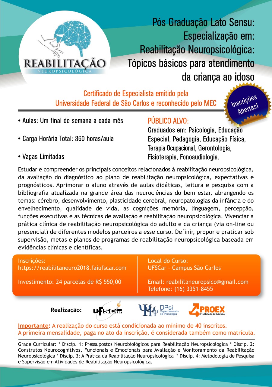 Informações sobre disciplinas, corpo docente, cronograma completo e valores de investimento estão disponíveis na plataforma box UFSCar. Dúvidas podem ser esclarecidas pelo telefone (16) 3351-8455 ou pelo e-mail reabilitaneuropsico@gmail.com.