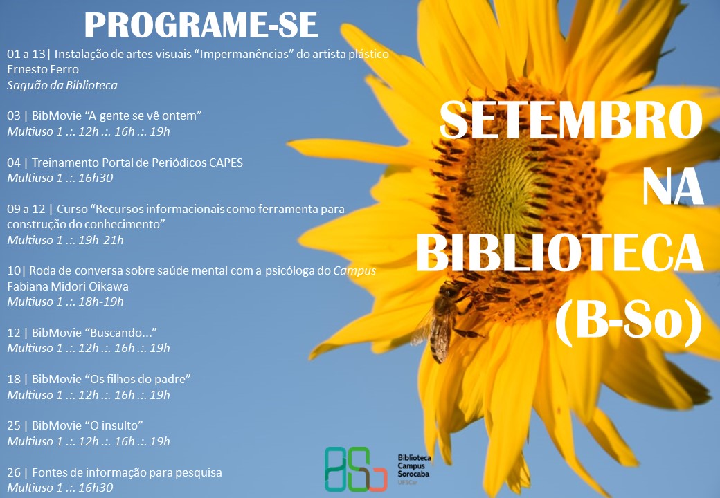 Outra iniciativa é o curso "Recursos informacionais como ferramenta para construção do conhecimento", realizado de 9 a 12 de setembro, entre 19 e 21 horas. Já no dia 10, a Biblioteca sedia roda de conversa sobre saúde mental, com Fabiana Midori Oikawa, psicóloga do Campus, a partir das 18 horas. Em 26 de setembro, haverá o curso "Fontes de informação para pesquisa", às 16h30. A atividade abordará temas como periódicos eletrônicos, e-books, bases de dados, repositórios institucionais e ferramentas para citações e referências.
