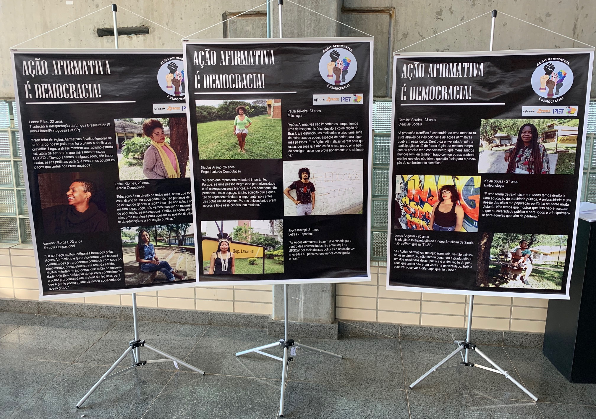 Também em cartaz está a mostra "Ação afirmativa é democracia!", desenvolvida pelo Programa de Educação Tutorial (PET) Usina de Reflexão com o objetivo de promover reflexões sobre os efeitos da implementação das políticas de ações afirmativas e das cotas para ingresso nas universidades públicas, que produziram, nas últimas duas décadas, mudanças no Ensino Superior do País, democratizando o acesso e diversificando o perfil da comunidade universitária. A exposição apresenta biografias de estudantes que se beneficiaram das políticas de cotas, revelando vantagens e desafios e destacando a atuação desses alunos dentro da Universidade em diversos cursos e projetos. Os banners podem ser vistos até 13 de setembro, no espaço de convivência.