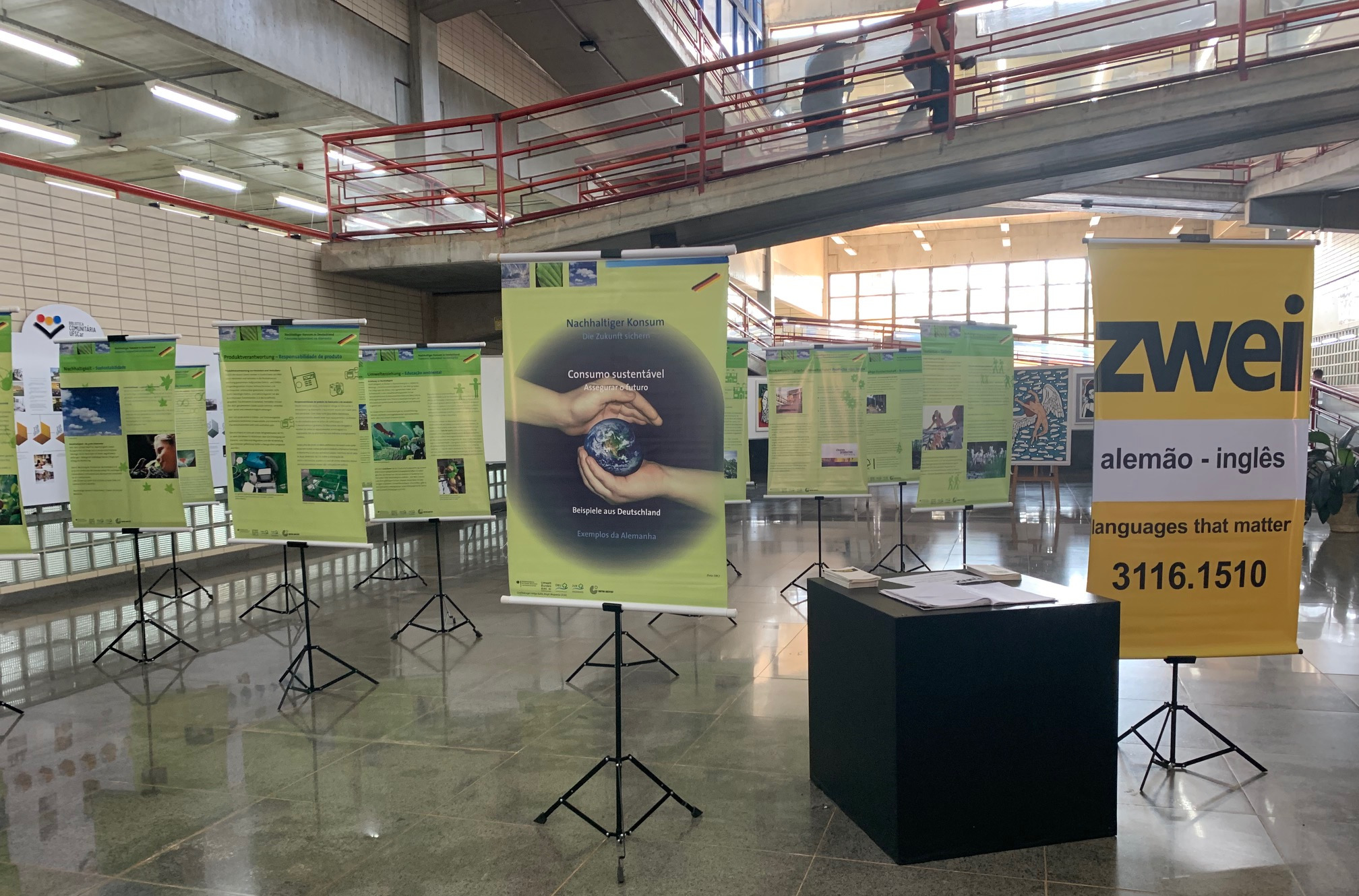 Neste mês de setembro, a Biblioteca Comunitária (BCo) da UFSCar apresenta quatro exposições ao público. Uma delas, intitulada "Consumo sustentável", tem banners informativos sobre a importância do consumo consciente, com exemplos de práticas implementadas na Alemanha. A mostra, organizada pela escola de Alemão Zwei, está aberta para visitação até 27 de setembro, no saguão principal da BCo.