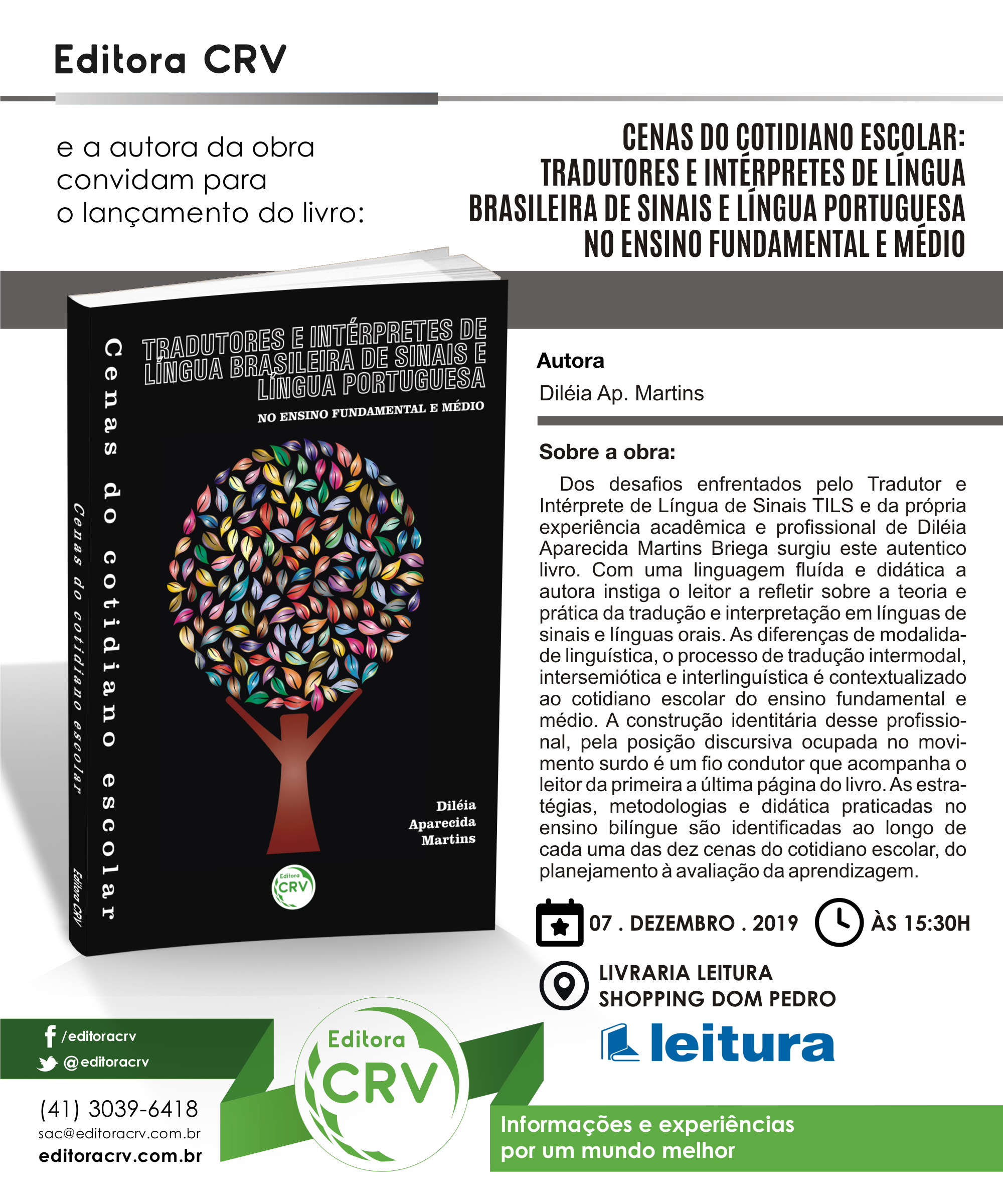 A docente da UFSCar Diléia Aparecida Martins, do Departamento de Psicologia (DPsi), está lançando o livro "Cenas do cotidiano escolar: tradutores e intérpretes de Língua Brasileira de Sinais e Língua Portuguesa no Ensino Fundamental e Médio", publicado pela Editora CRV.