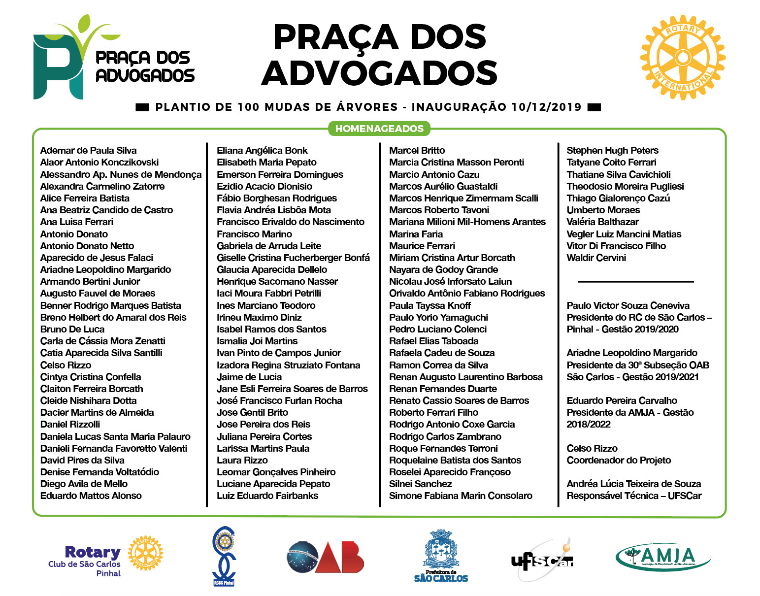 Um dos diferenciais desta edição foi o foco das homenagens, direcionado aos profissionais de Direito inscritos na OAB. Cada advogado doou 150 reais, correspondente ao plantio e manutenção de uma muda. "Esse projeto é encantador. Todos os advogados foram unânimes no sentido de parabenizar a iniciativa, que incentiva a conscientização das pessoas sobre o meio ambiente e a arborização, imprescindíveis na vida do ser humano. Destaco também a união dos advogados, porque foi um projeto que movimentou toda a OAB", contou Ariadne Leopoldino Margarido, Presidente da Subseção de São Carlos da OAB. Na praça, foi afixada uma placa com o nome dos 100 homenageados.