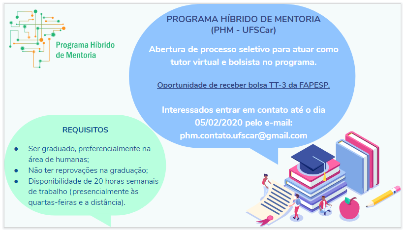 O Programa Híbrido de Mentoria (PHM), do Portal dos Professores da UFSCar, abriu processo seletivo para pessoas interessadas em atuar como tutor virtual e bolsista no Programa. Os candidatos devem ser graduados, preferencialmente na área de Humanas; não ter reprovações no histórico da graduação; e ter disponibilidade para trabalhar 20 horas semanais - presencialmente às quartas-feiras e, também, a distância.