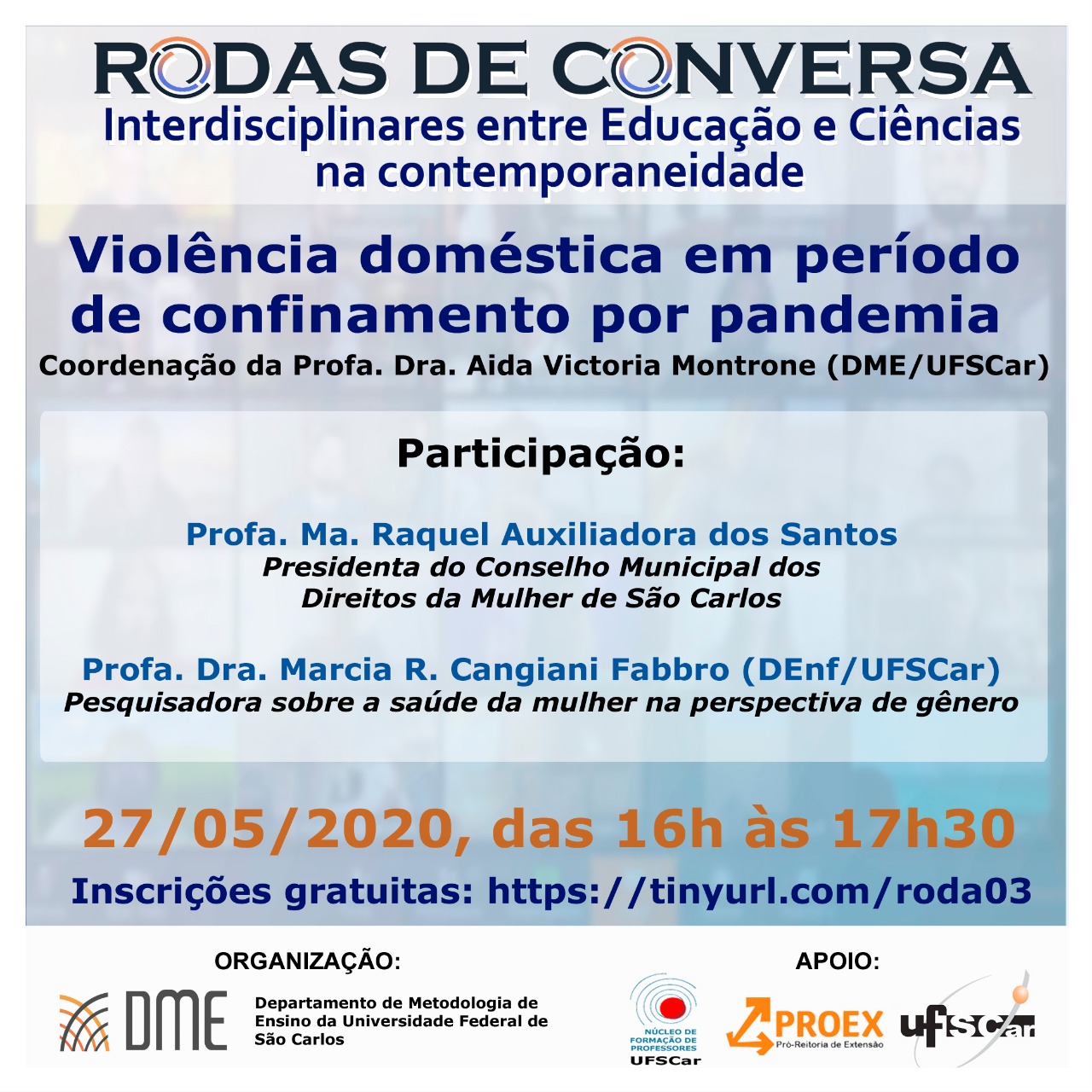 Nos meses de maio e junho, o Departamento de Metodologia de Ensino (DME) da UFSCar, com o apoio do Núcleo de Formação de Professores (NFP) da Instituição, realiza uma série de rodas de conversa virtuais e interdisciplinares para discutir o cenário atual de pandemia do novo Coronavírus e suas implicações na Educação e nas Ciências.