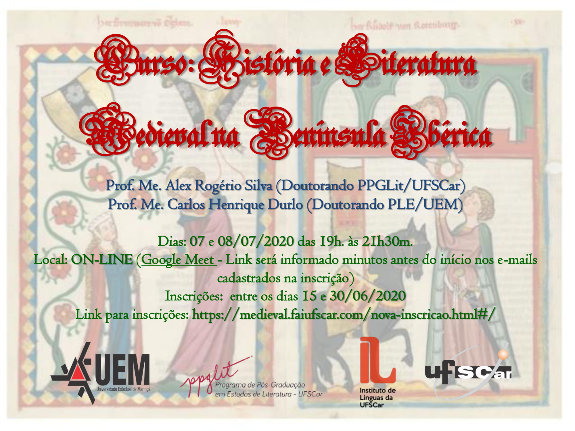 O Instituto de Línguas (IL) da UFSCar está com inscrições abertas até 30 de junho para a oficina de Língua e Cultura intitulada "História e Literatura Medieval na Península Ibérica", que será ministrada pelos pesquisadores Alex Rogério Silva e Carlos Henrique Durlo.