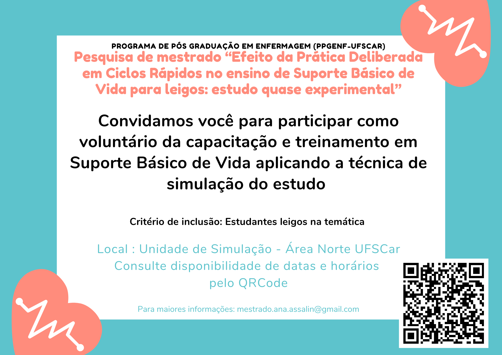Uma pesquisa de mestrado do Programa de Pós-Graduação em Enfermagem (PPGEnf) da UFSCar tem como objetivo analisar o conhecimento cognitivo, performance e autoconfiança em Suporte Básico de Vida (SBV) com o uso do Desfibrilador Externo Automático (DEA) de estudantes universitários considerados leigos, antes e após experiência simulada com Prática Deliberada em Ciclos Rápidos. O estudo é aberto à participação de estudantes de graduação e pós-graduação da UFSCar que não tenham conhecimentos prévios de SBV e uso de DEA.