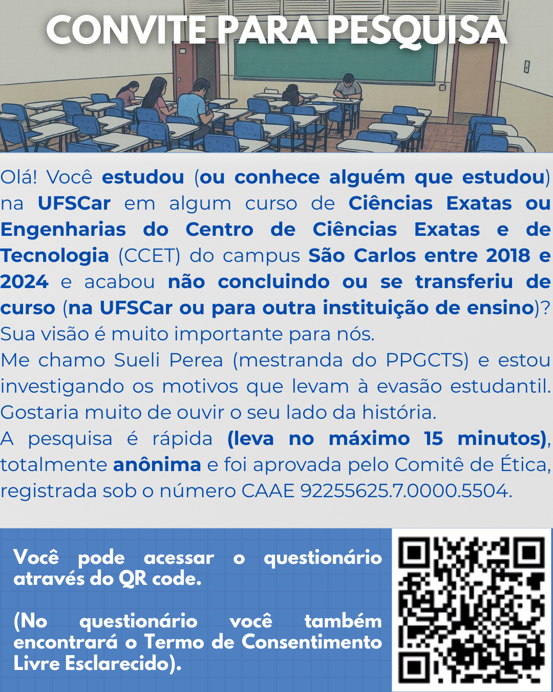 O estudo, intitulado "Da evasão à permanência na universidade pública: abordagens a partir do enfoque Ciência, Tecnologia e Sociedade", é conduzido pela mestranda Sueli Perea, do Programa de Pós-Graduação em Ciência, Tecnologia e Sociedade (PPGCTS) da UFSCar, com orientação da professora Ariadne Chloë Mary Furnival, do Departamento de Ciência da Informação (DCI) da UFSCar.