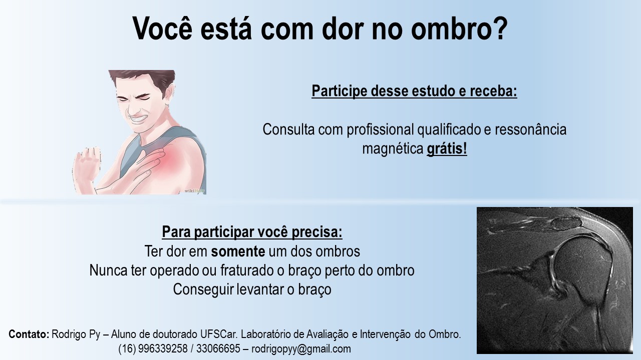 O Laboratório de Avaliação e Intervenção do Ombro do Departamento de Fisioterapia (DFisio) da UFSCar oferece consulta profissional fisioterapêutica e encaminhamento para exame de ressonância magnética gratuita para pessoas que sofrem dor em um dos ombros. Os resultados dos exames serão utilizados por Rodrigo Py Barreto, doutorando do Programa de Pós-Graduação em Fisioterapia (PPGFt), para a elaboração de sua tese "Dor no ombro: paradoxo entre o modelo patoanatômico e disfunção de movimento", sob orientação da docente Paula Rezende Camargo, do DFisio. O objetivo da pesquisa é verificar a associação entre testes clínicos, movimentos realizados pela escápula e achados da ressonância magnética em indivíduos com dor no ombro.