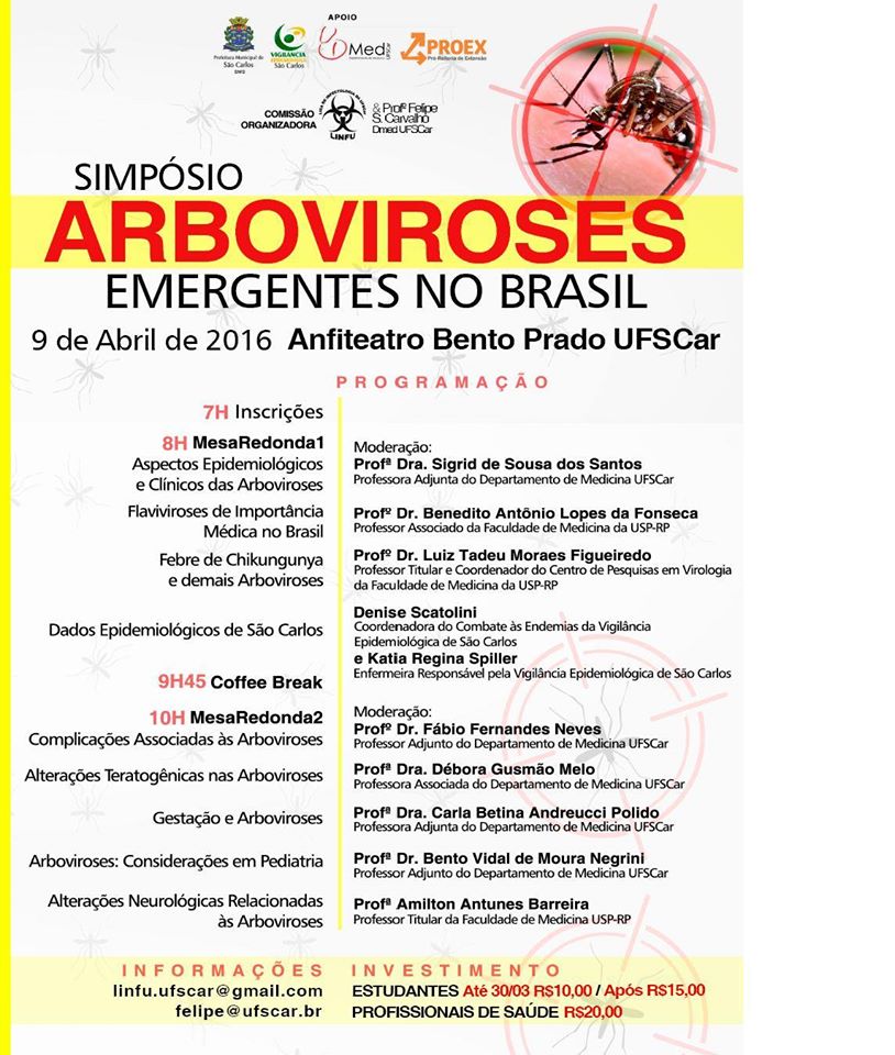 No dia 9 de abril, a Liga de Infectologia (LINFU) da UFSCar, juntamente com o professor Felipe Santos de Carvalho, do Departamento de Medicina (DMed), promove o Simpósio Arboviroses e Doenças Emergentes no Brasil, que tem como público-alvo estudantes e profissionais de saúde. O evento acontece no momento em que o curso de Medicina da UFSCar completa 10 anos de existência e objetiva complementar a formação acadêmica dos alunos participantes, bem como oferecer suporte para o aprimoramento do atendimento nas redes de saúde no município de São Carlos e região. Também tem o intuito de unir estes profissionais para possíveis parcerias e futuras pesquisas relacionadas às arboviroses, que são doenças causadas pelos arbovírus, que incluem o vírus da dengue, zika, chikungunya e febre amarela.