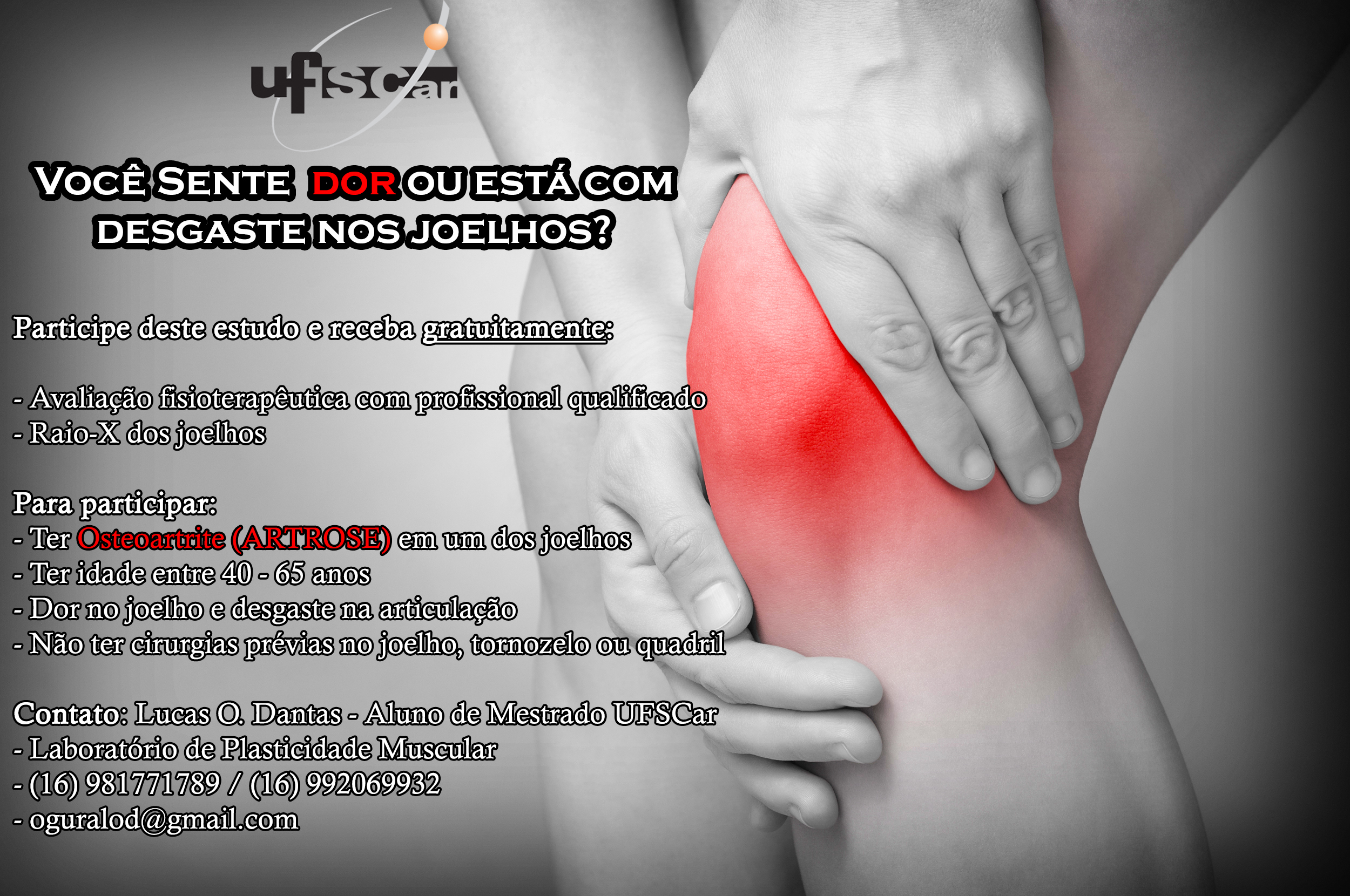O Laboratório de Plasticidade Muscular do Departamento de Fisioterapia (DFisio) da UFSCar oferece avaliação e radiografia dos joelhos para pessoas com idades entre 40 e 65 anos, que tenham Osteoartrite (artrose) em um dos joelhos, dor e desgaste na articulação e que não tenham sido submetidas a cirurgias prévias no joelho, tornozelo ou quadril. As avaliações são conduzidas pelo fisioterapeuta e aluno de mestrado do Programa de Pós-Graduação em Fisioterapia da UFSCar Lucas Dantas, sob orientação da docente Tânia de Fátima Salvini, do DFisio.