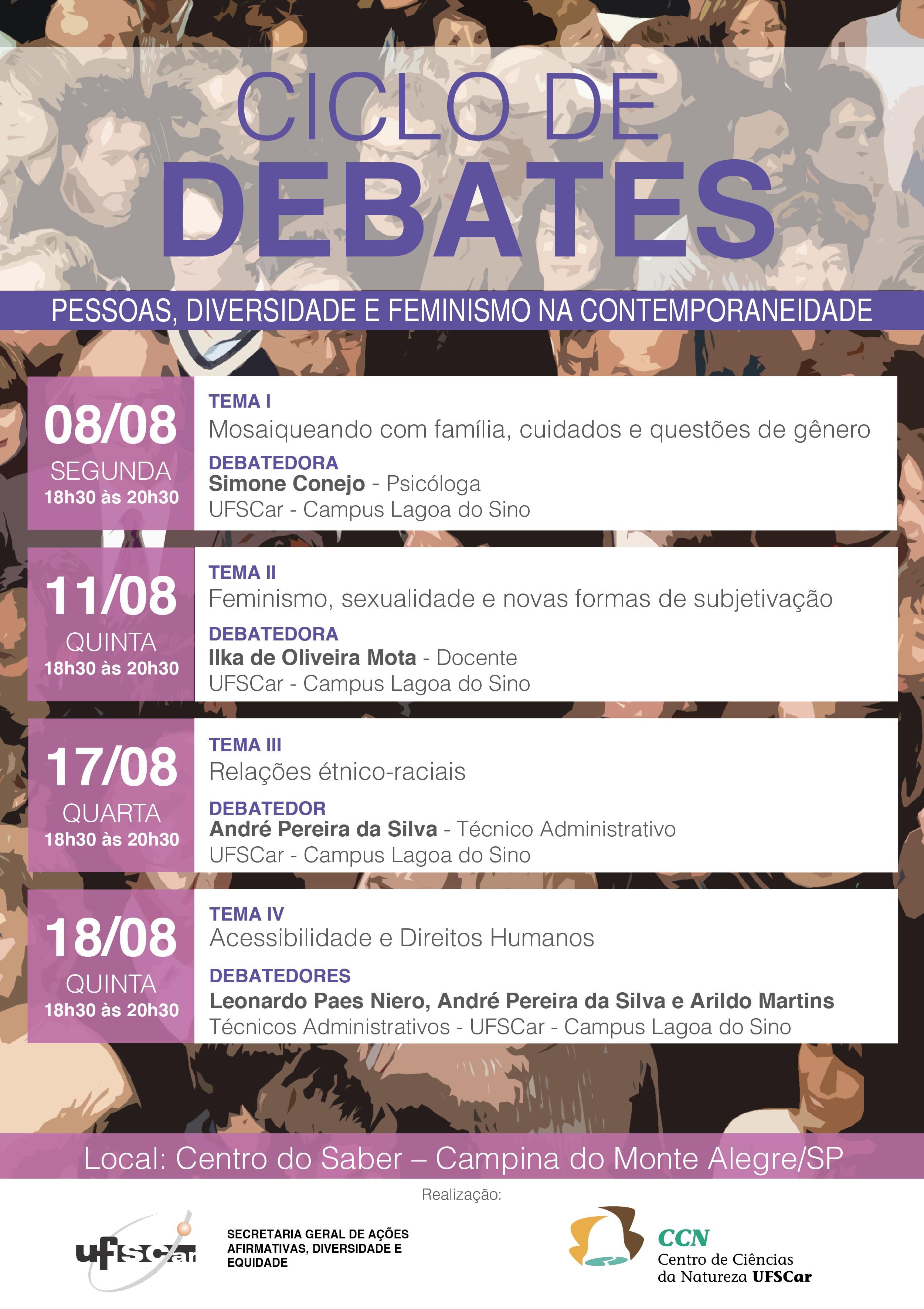 Na primeira quinzena de agosto, o Campus Lagoa do Sino da UFSCar, por meio da Secretaria Geral de Ações Afirmativas, Diversidade e Equidade (Saade), promove o Ciclo de Debates Pessoas, diversidade e feminismo na contemporaneidade.