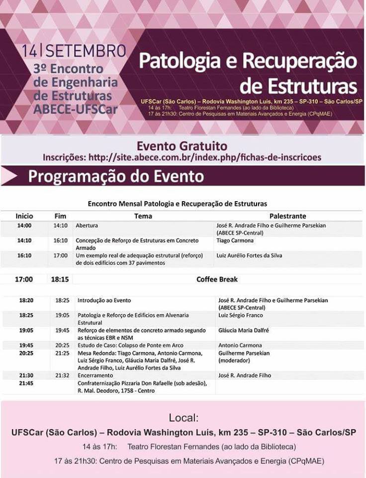 O Campus São Carlos sedia no dia 14 de setembro o 3° Encontro de Engenharia de Estruturas (Abece-UFSCar), que neste ano aborda o tema "Patologia e Recuperação de Estruturas". Esse é o terceiro ano consecutivo que o Encontro é realizado na UFSCar e consolida-se como um importante evento na área de Engenharia de Estruturas.